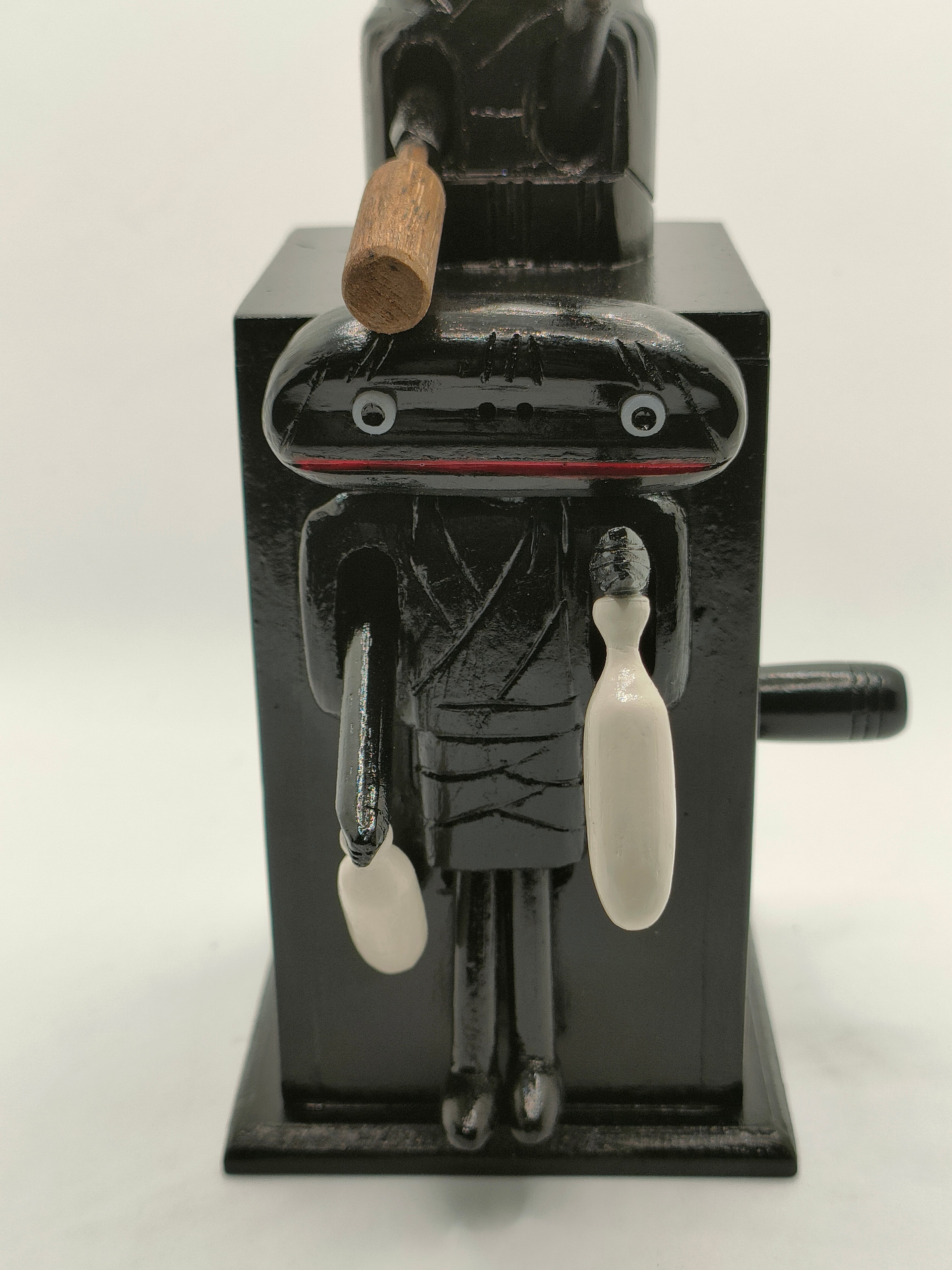 上の人形が首を右へ左へ振りながら大きな棒でリズミカルに叩き、下の人形はそのたびに酒瓶を握った両手をバタバタと動かします。その滑稽な動きは、見る人を思わず笑顔にすること間違いなし。そんな愛らしい動きを、くるくるとつまみを回すだけで楽しめるからくり人形です。